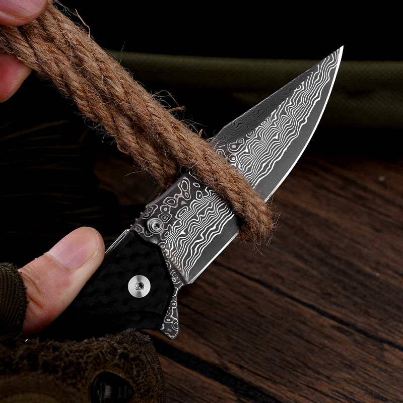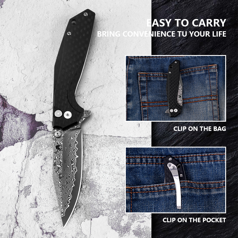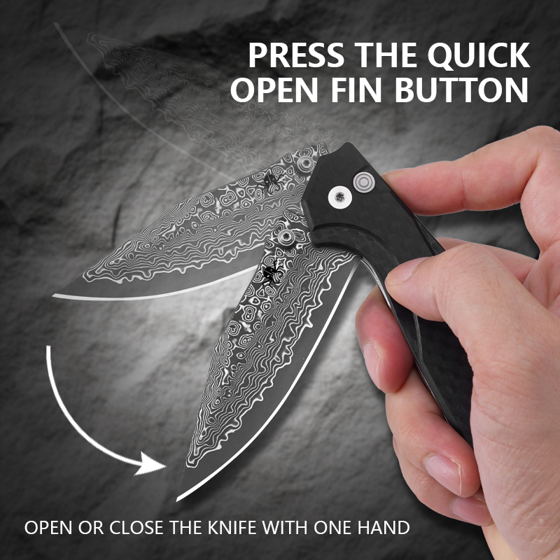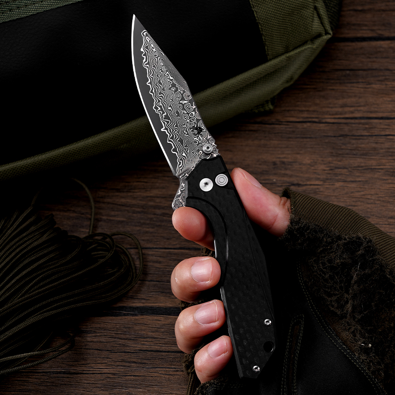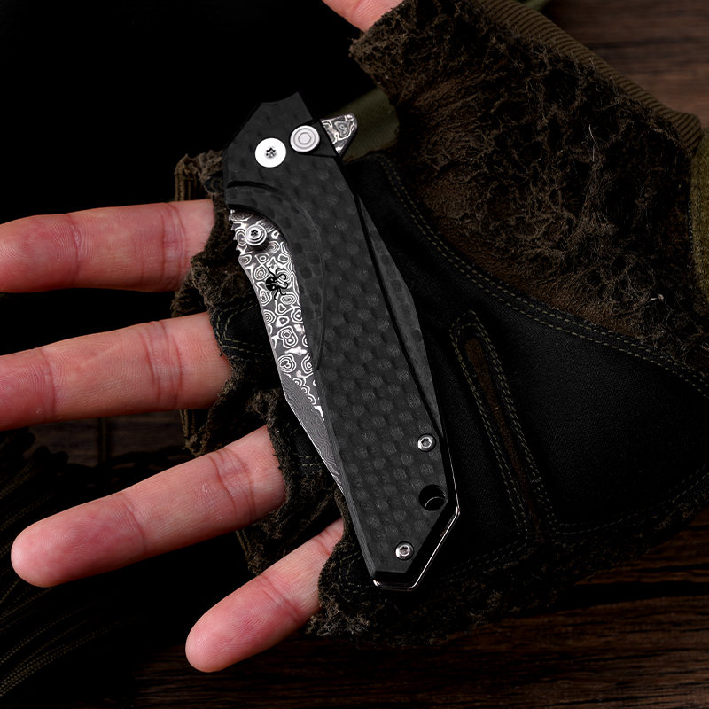 KLAKEN J284 NOIR, Damascus Blade With G10 Handle Button Lock EDC Folding Pocket